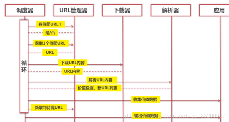 下图是爬虫的一个顺序图,从顺序图中可以看出调度器通过训练调用URL管理器、网页下载器、网页解析器来不断获取网络数据。