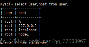 使用以下的查询SQL语句可以查看用户名和对应支持访问的IP地址,因为我们在上面已经设置root用户可以支持远程登录了,所以可以看到有一个root用的host是%。