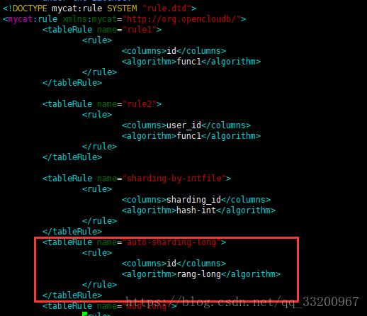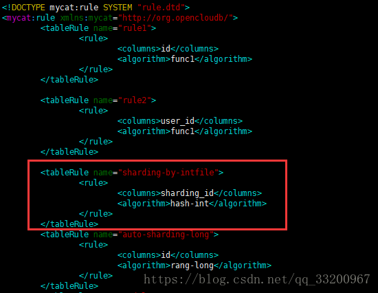 如果有多个数据库服务器,还要配置插入数据的分片ID,在插入数据的时候,会根据这个ID进行分布存储。我们之所以使用这个分片规则,这个是因为我们在配置schema.xml的时候指定的分片规则是sharding-by-intfile,这个规则我们可以在rule.xml中找到。如下图:
