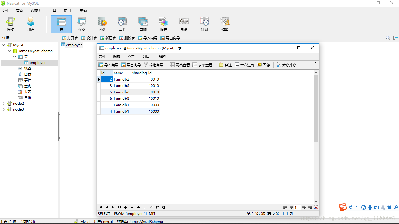 最后在这两个数据库中都创建一张employee表,结构需要一致,否则会出错的。这个两张是真实表,为什么叫真实表,因为在Mycat中还有一个逻辑表,Mycat中的逻辑表就是指向这两张真实表的。