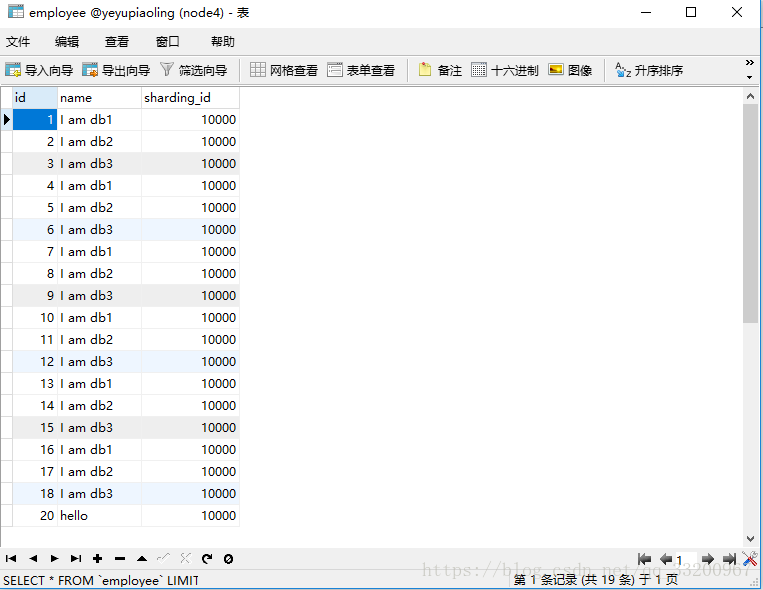 insert into employee(id,name,sharding_id) values(1, 'I am db1',10000);