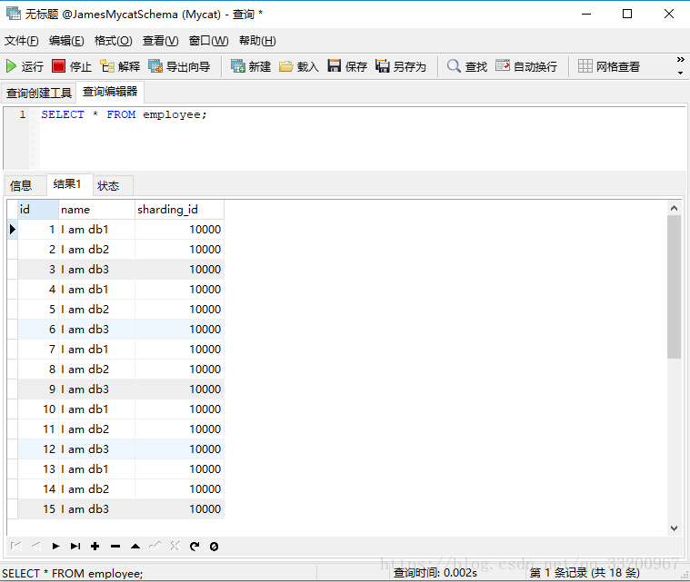 然后连接node1的Mycat,记得Mycat默认的端口是8066,账号和密码是server.xml中设置的。连接之后可以看到一个JamesMycatSchema数据库,这个就是我们在schema.xml配置的,可以看到有一张employee表,我们新建查询在这里插入一些数据: