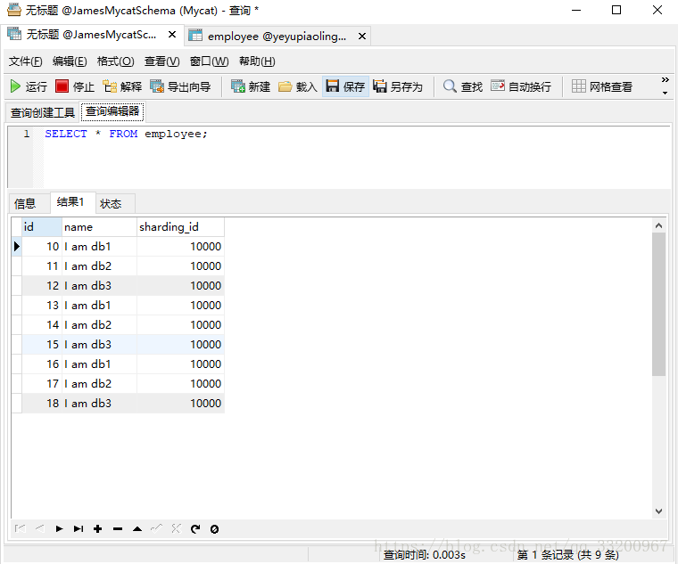 在Mycat中可以可以看到employee表已经插入的全部数据。