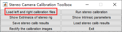 上面都完成之后,应该有Calib_Results_left.mat和Calib_Results_right.mat这两个文件。然后在命令区输入命令:stereo_gui,会弹出以下界面,点击Load left and right calibration files按钮。