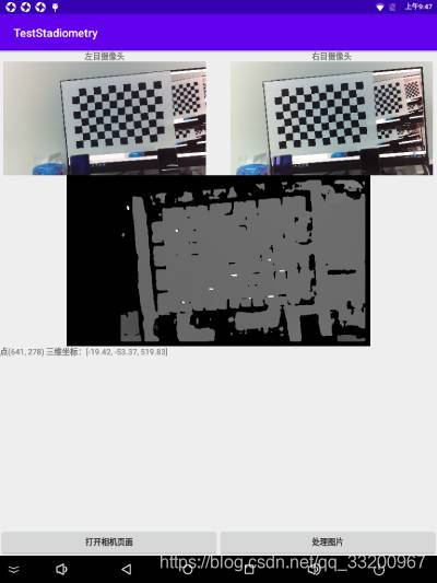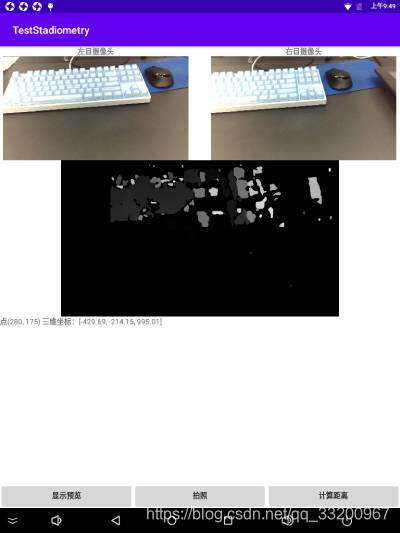 接下来的处理方式就跟之前的一样了,使用StereoBMUtil工具类读取分割后的左右目摄像头的图像执行计算,把结果图在ImageView上显示,然后为ImageView添加点击获取坐标事件。用户在点击之后会获取到图像中的坐标,然后使用这个坐标从xyz中获取拍摄物体的实际三维坐标。