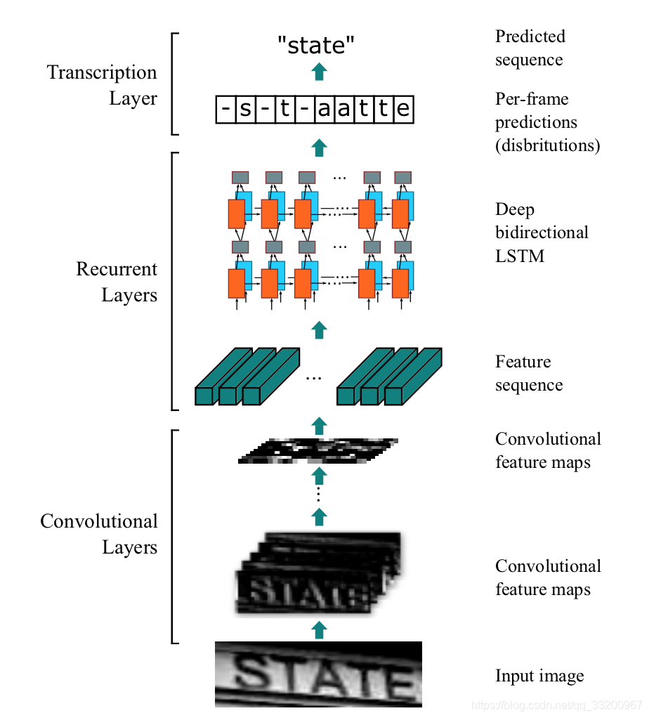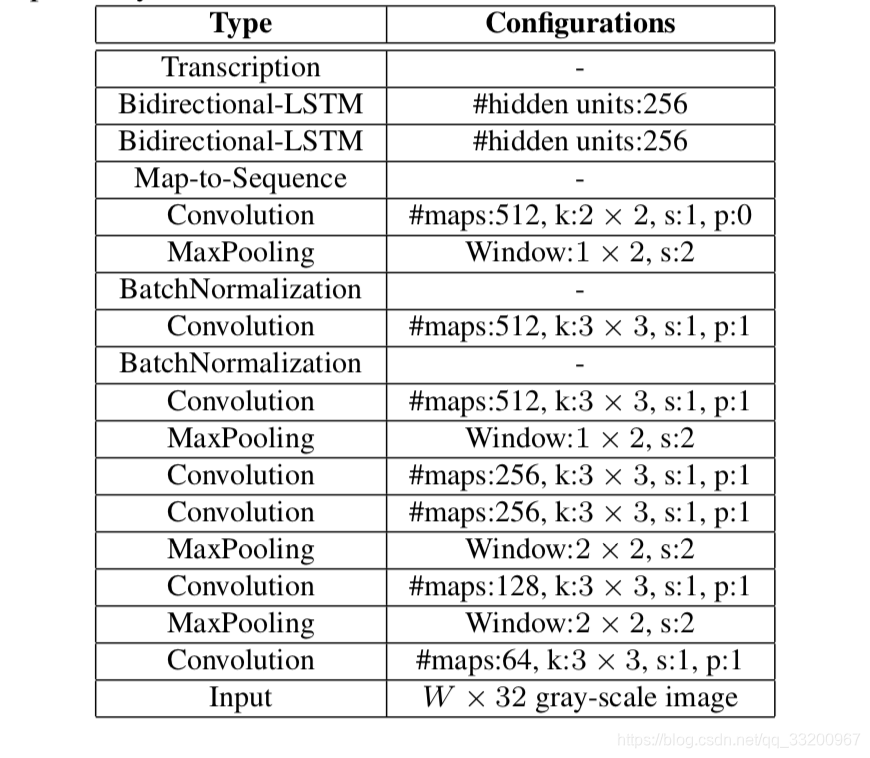 CRNN的结构如下,一张高为32的图片,宽度随意,一张图片经过多层卷积之后,高度就变成了1,经过paddle.squeeze()就去掉了高度,也就说从输入的图片BCHW经过卷积之后就成了BCW。然后把特征顺序从BCW改为WBC输入到RNN中,经过两次的RNN之后,模型的最终输入为(W, B, Class_num)。这恰好是CTCLoss函数的输入。