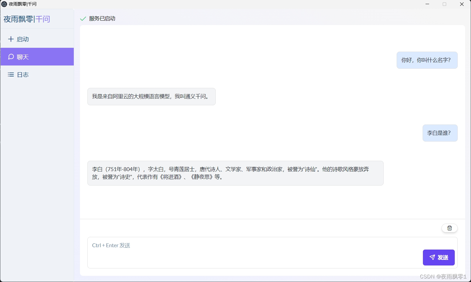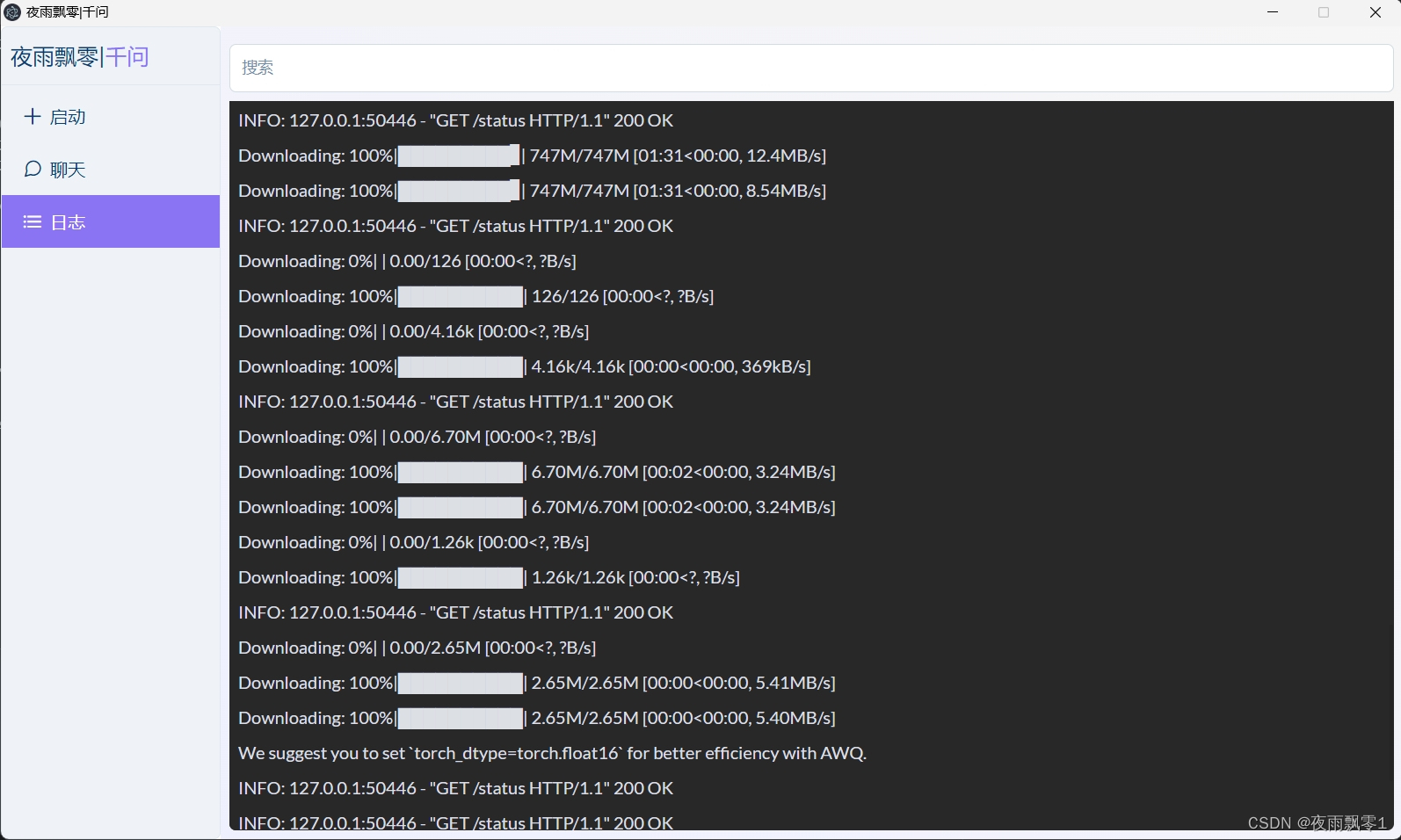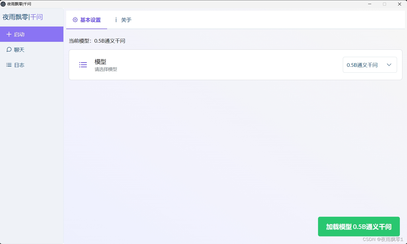 下载并双击启动.exe后,你将进入夜雨飘零·千问启动器的主界面。这个简洁直观的工具主要分为三个页面:启动页面、聊天页面和日志页面。